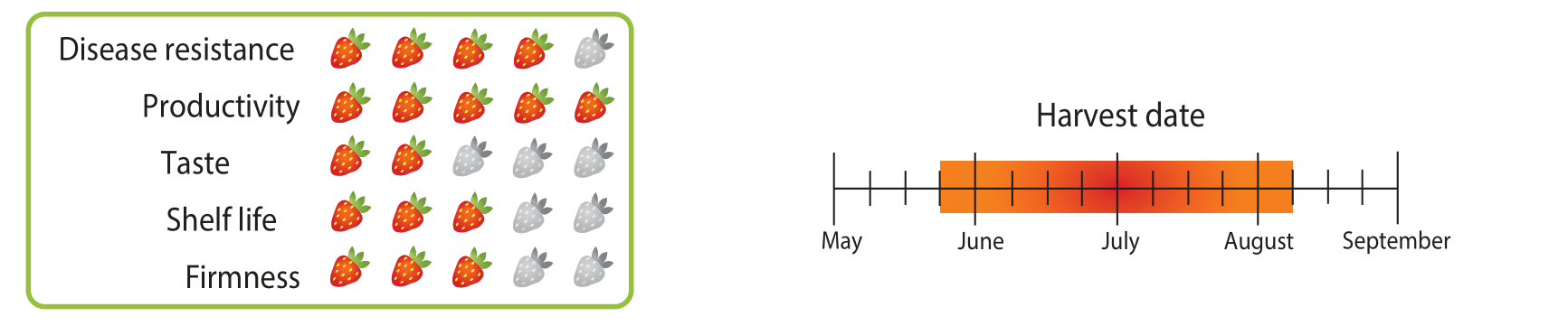 Ferris is a very productive, everbearing strawberry variety from Flevo Berry. The fruit size and set are good throughout the season, resulting in a very high proportion of top-quality fruit. Combined with the bright red colour of the berries, this ensures an attractive appearance all season long. The variety is very high-yielding. This variety is suitable for both open-field and substrate cultivation and continuously produces new blossoms. For trellis cultivation, the flower stalks are long enough and easy to remove. Support ties are highly recommended. The variety exhibits very strong tolerance to Phytophthora cactorum and powdery mildew. The achenes of Ferris are set slightly deeper, which contributes to its attractive appearance.